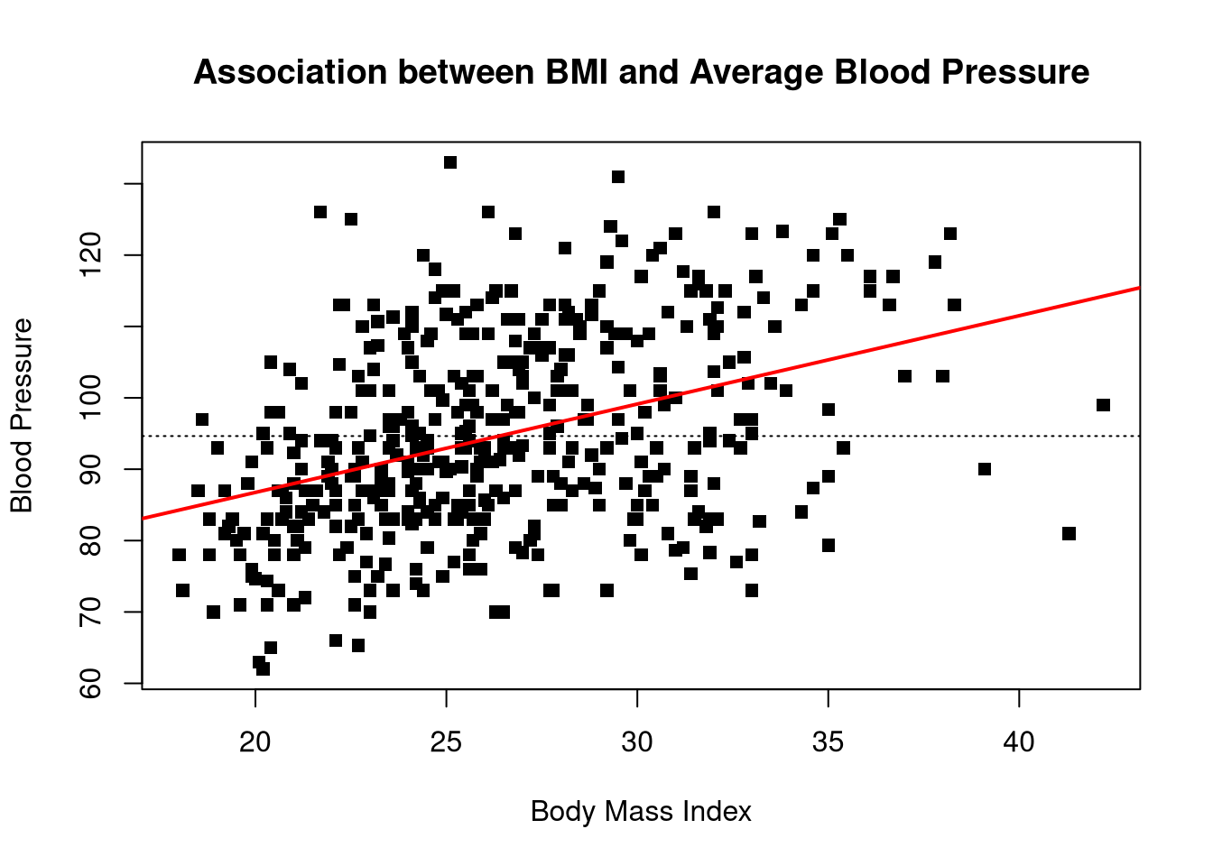 We see what looks like a strong, positive effect of BMI on blood pressure. In other words, higher BMI tends to be associated with higher blood pressure levels.