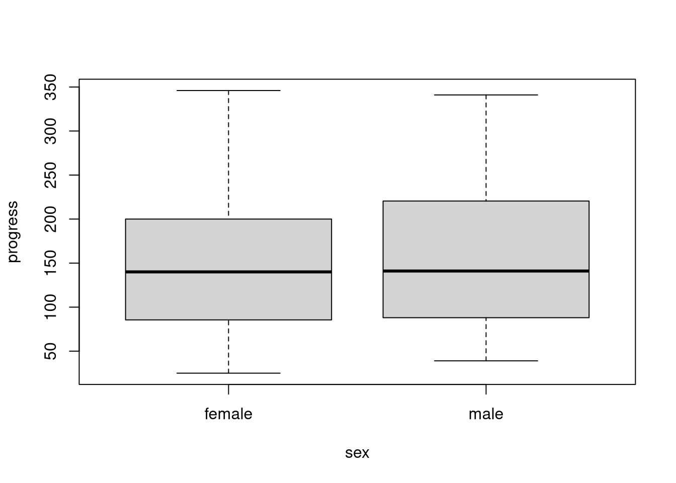 When we use the formula interface, we define the plot’s structure through an R formula object that we specify as the first argument to boxplot(). In this formula, progress ~ sex1, we specify the plotted variable on the left-hand side of the formula and we put the grouping factor on the right-hand side of the formula. We also have to use the data argument to specify a data frame where boxplot() can find the variables we’re referencing in the formula.