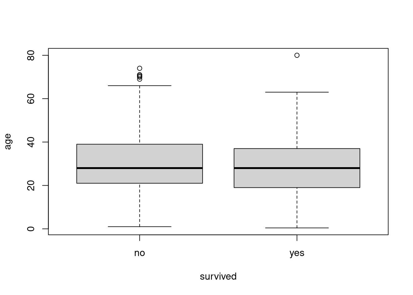 survived = 'yes') vs. non-survivors (survived = 'no')?NOTE: The titanic dataset is already loaded into the working directory of this webr session.