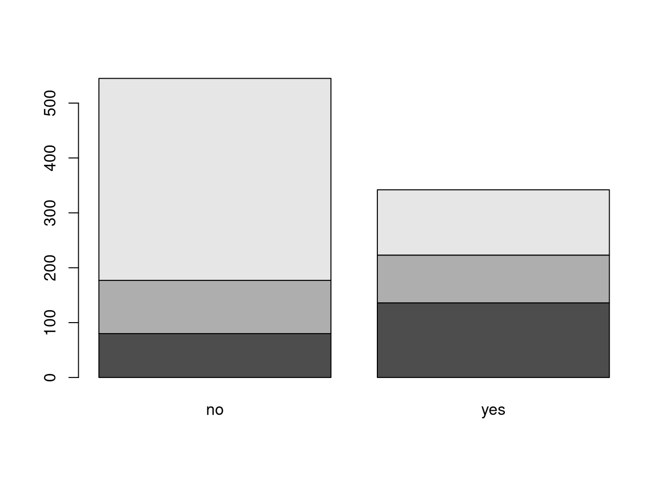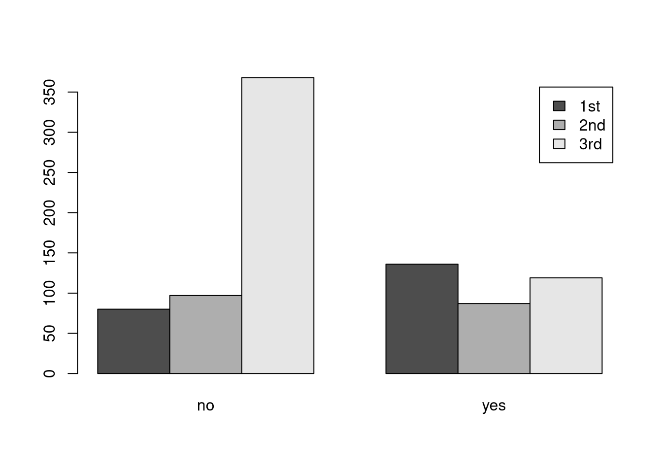 To create a conditional bar plot, we fist create a two-way contingency table, and then we plot that table with the barplot() function In the following code we use the titanic dataset to visualize the conditional distributions of ticket classes for the two survival groups.