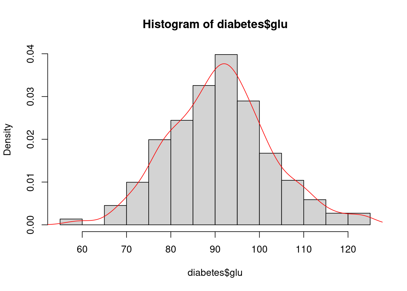 In this case, we cannot use the plot() function to create the kernel density layer since plot() would just replace the existing histogram with a new figure. Rather, we use the lines() function to add the appropriate curve as a new layer in the existing plot. Note that we’re explicitly extracting the x and y vectors from the object returned by density() to define the x and y coordinates of the line.