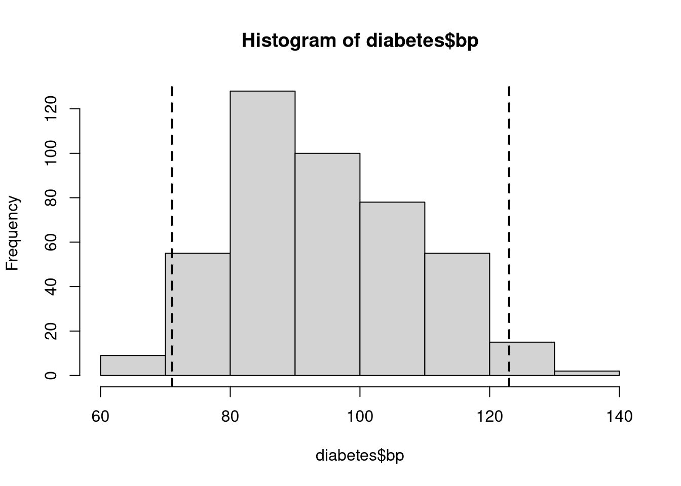 ci <- quantile(diabetes$bp, prob = c(0.025, 0.975))