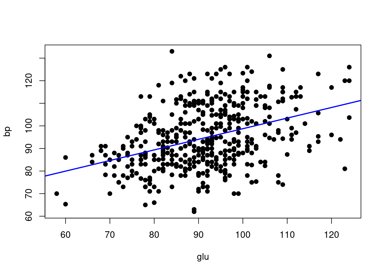 We can apply the same type of layering process to mark up scatterplots with additional information. In the following example, we add the least squares best fit line to a scatterplot showing the relation between average blood pressure, bp, and blood glucose levels, glu.