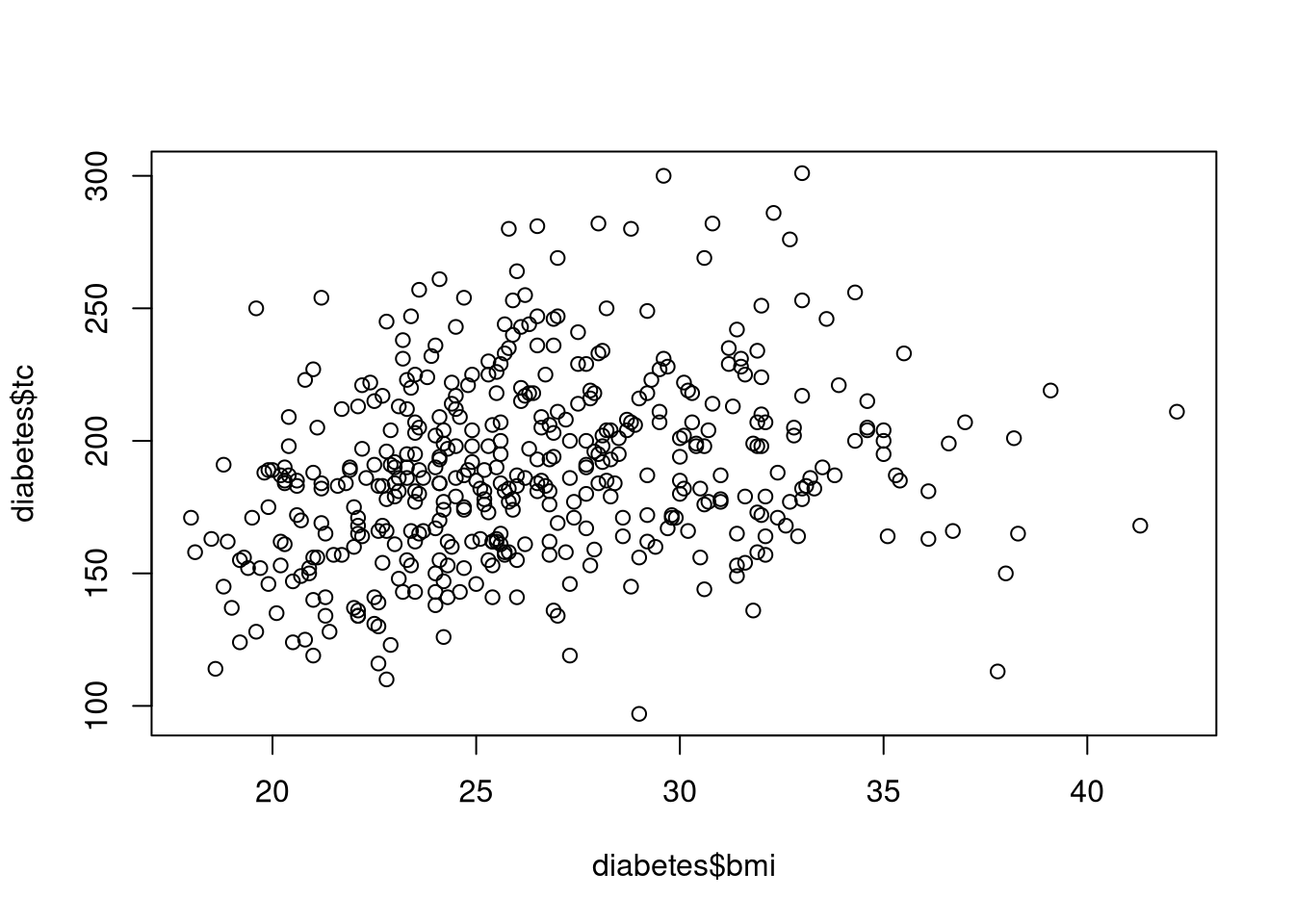 plot(y = diabetes$tc, x = diabetes$bmi)