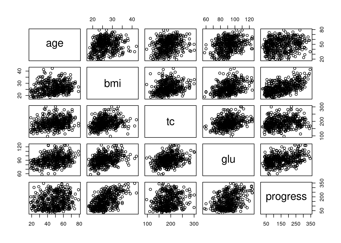 We make a simple scatterplot with the plot() function. For example, the following code uses the diabetes dataset to visualize the bivariate association between Body Mass Index, bmi, and Total Cholesterol, tc.