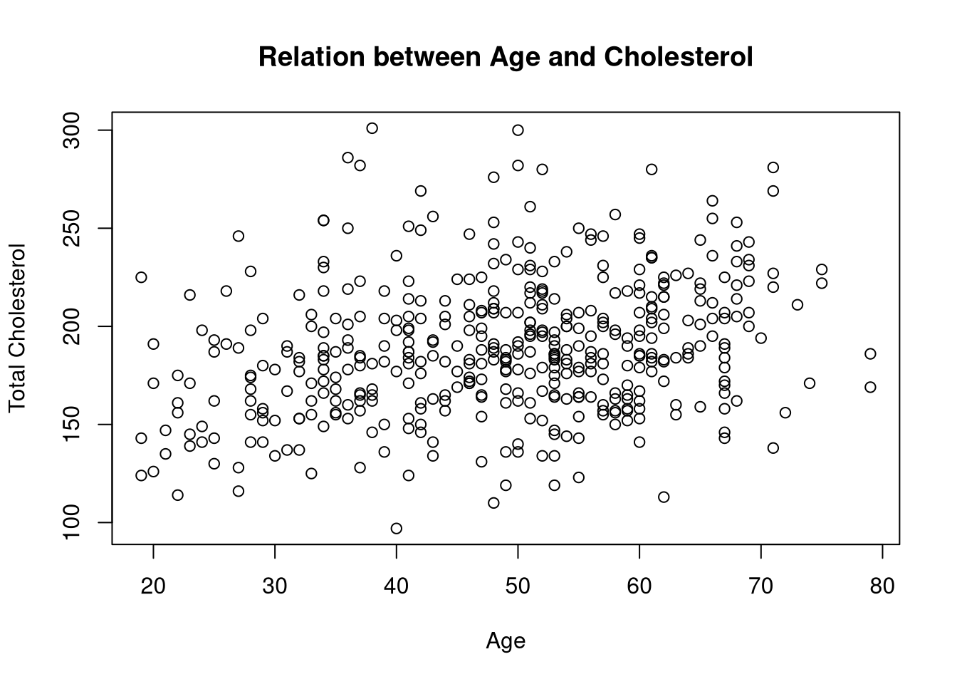 In this example, every point represents a different patient’s value of BMI and their level of total cholesterol. The points form a cloud with a slight upward trend, suggesting that higher BMI values tend to be associated with higher cholesterol levels, although the variability is substantial.