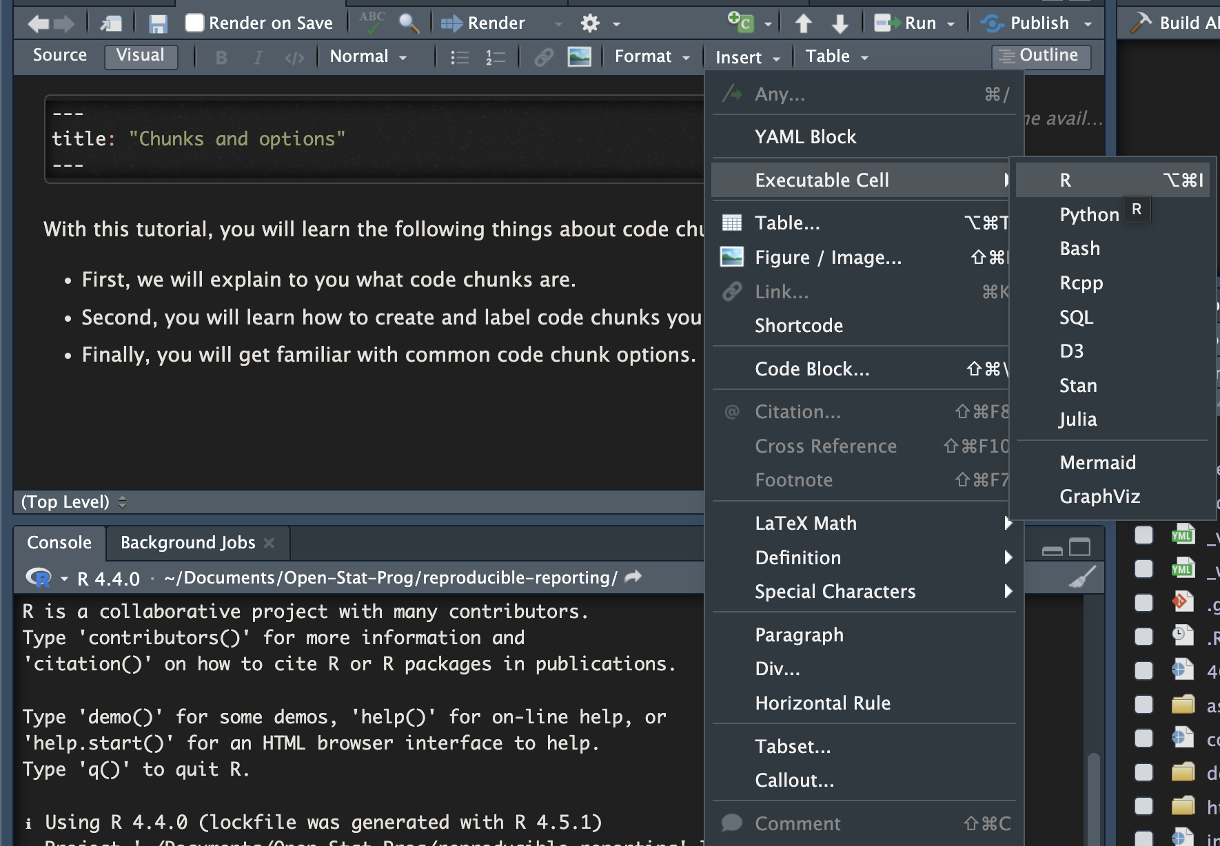 When working with Quarto documents, you can switch between a “Source”and a “Visual” mode in R studio. In ths Visual mode, you can click on “Insert” –> “Executable Cell” –> “R”. Here you also see the various other programming languages listed that are supported by Quarto.